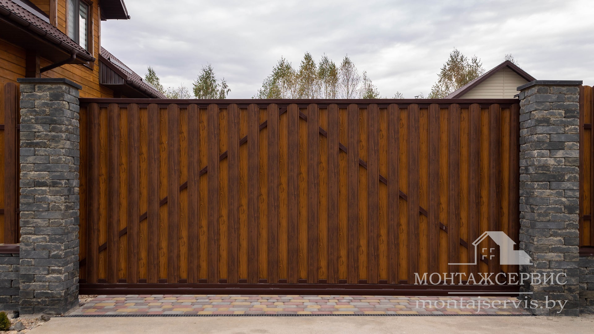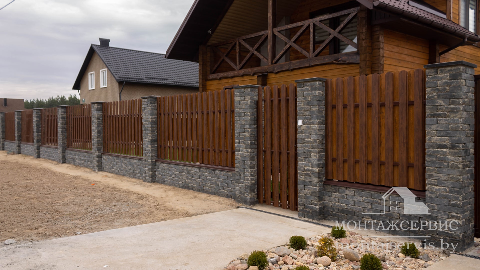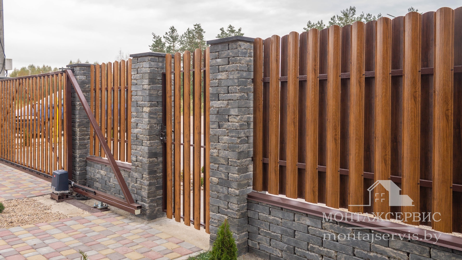 • Металлический штакетник РУБИН (130 мм) покрытие ДЕРЕВО ТЕМНОЕ/ЗОЛОТОЕ + ЛЕГО КИРПИЧ