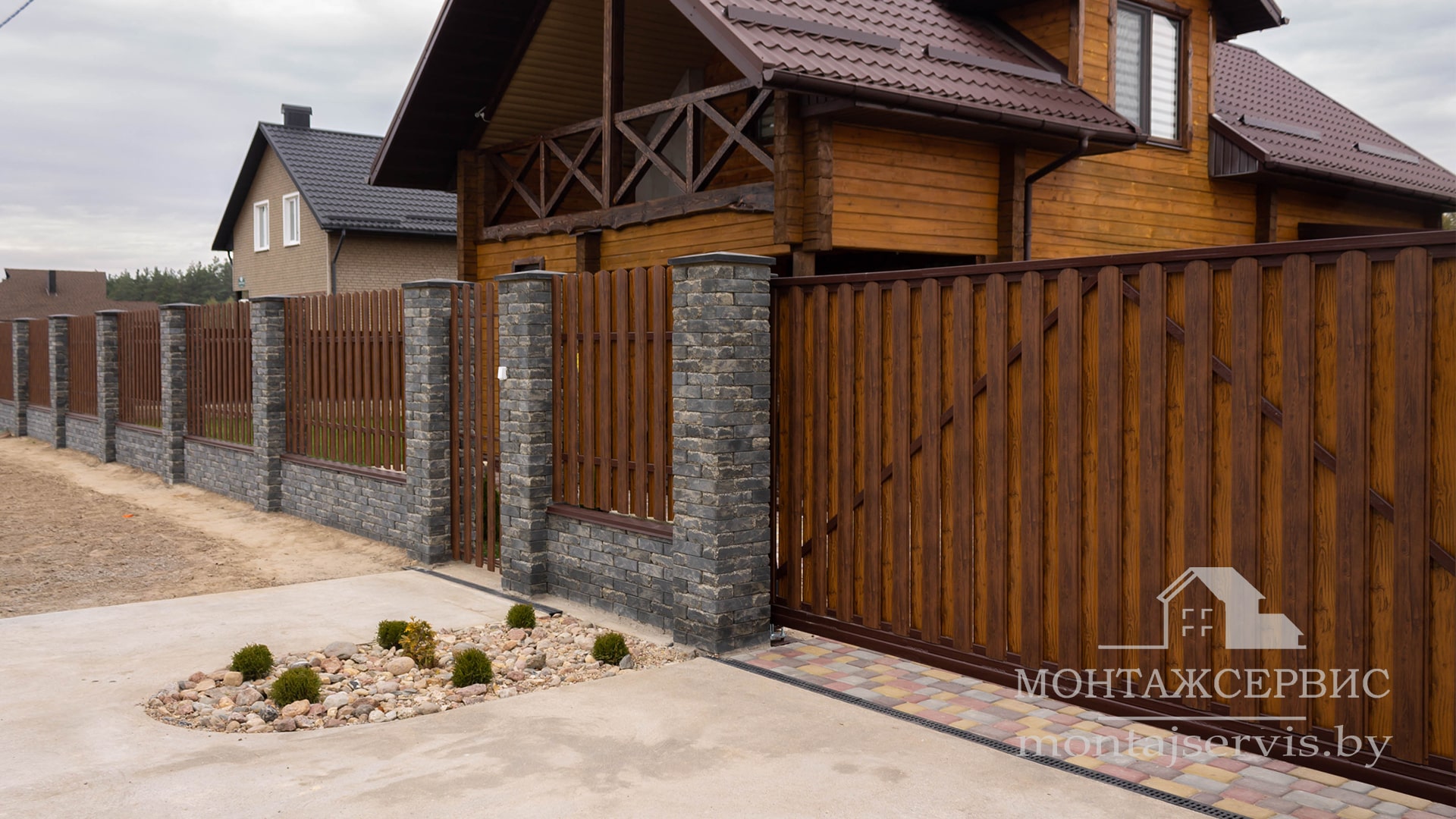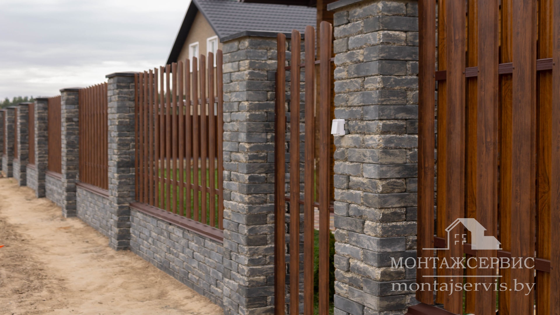 Металлический штакетник РУБИН (130 мм) покрытие ДЕРЕВО ТЕМНОЕ/ЗОЛОТОЕ + ЛЕГО КИРПИЧ