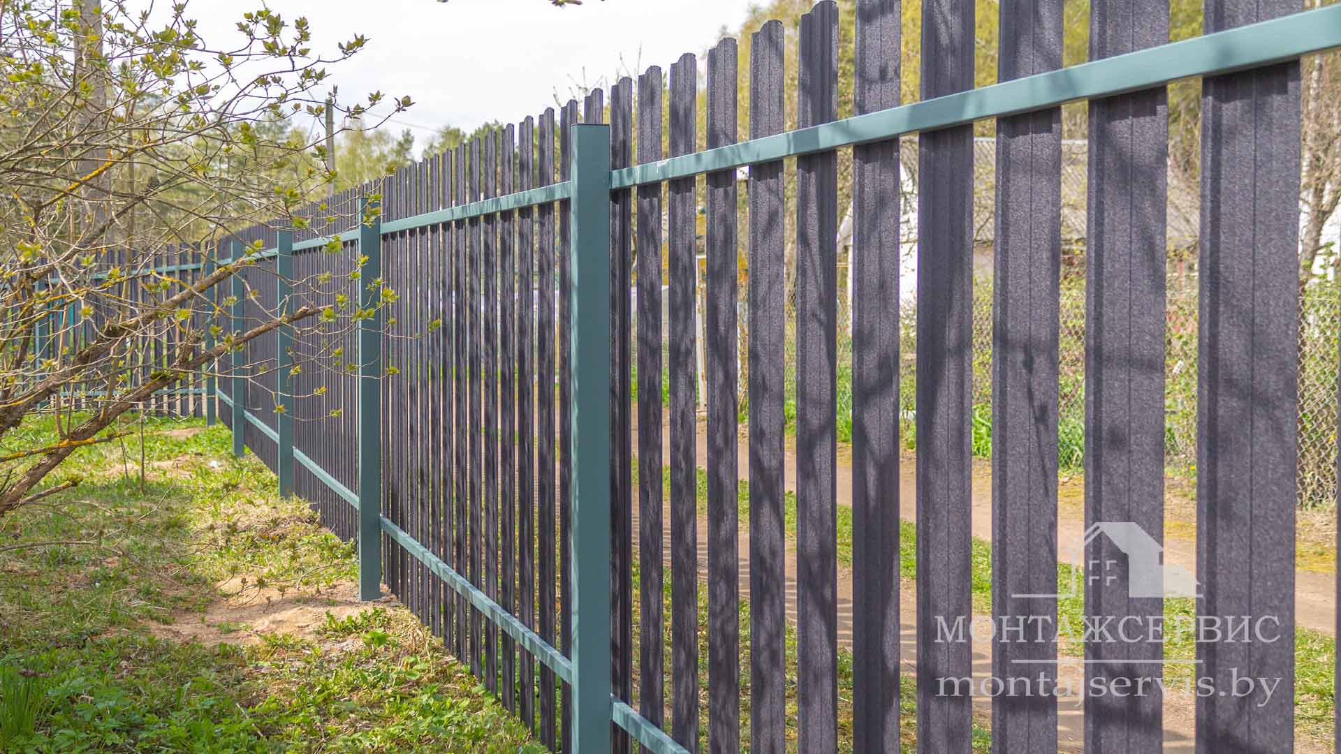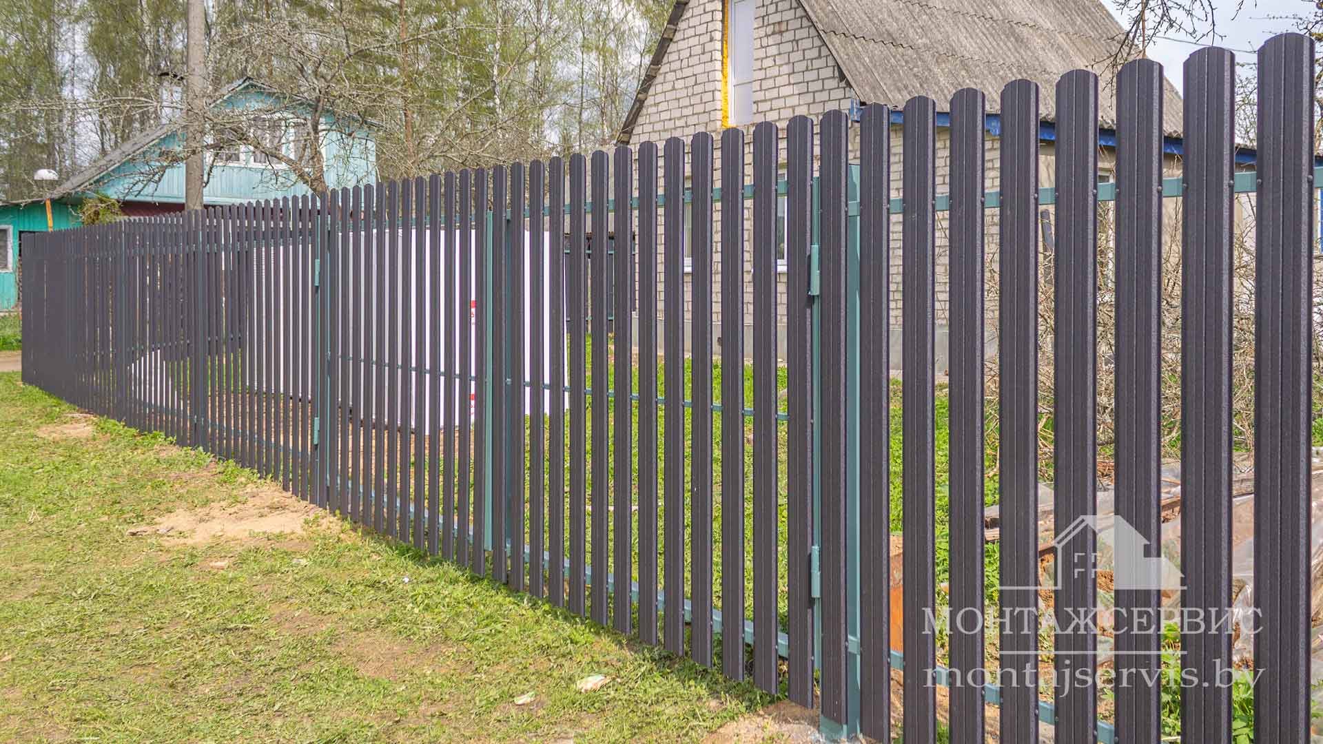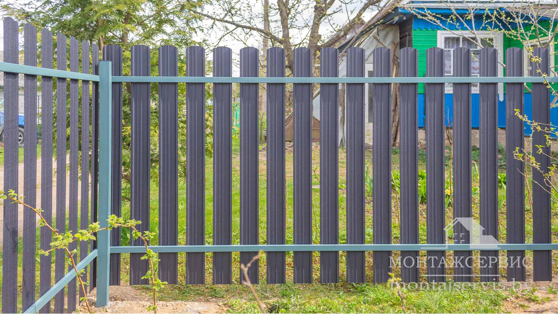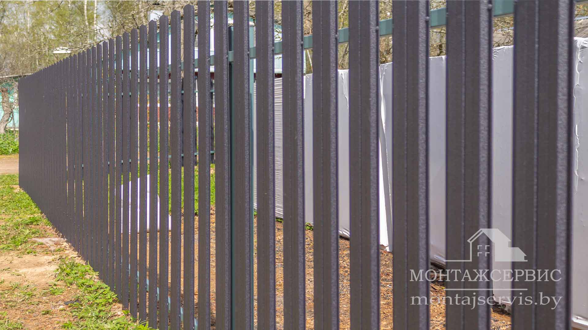 Монтаж забора из металлического штакетника "КЛАССИК 114 мм" RAl 5004 МАТ" + ворота распашные + калитка