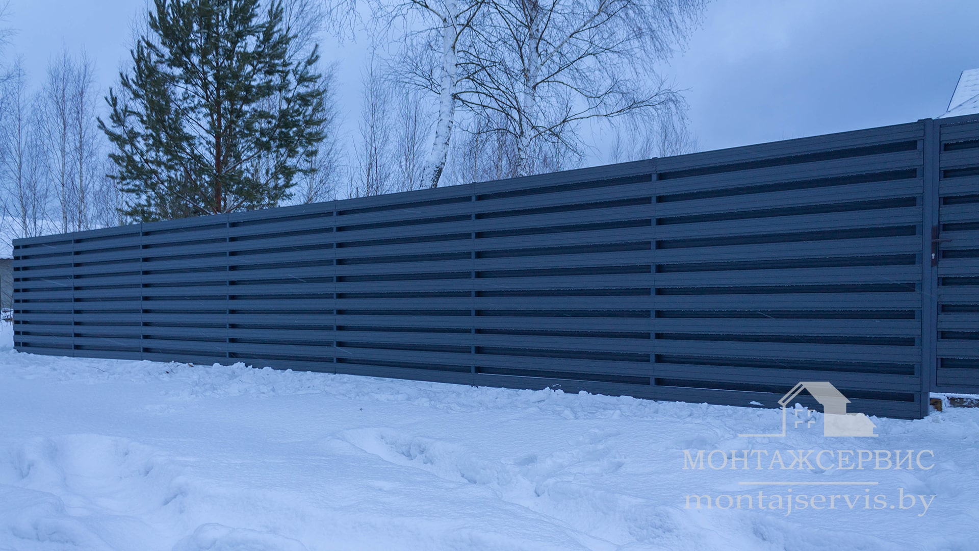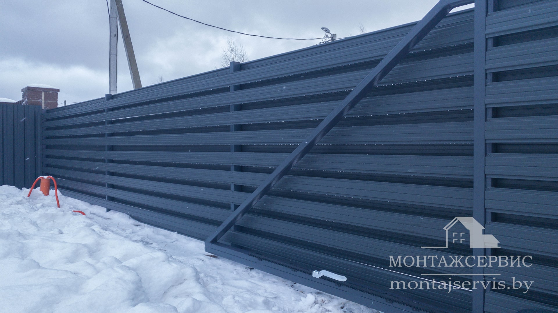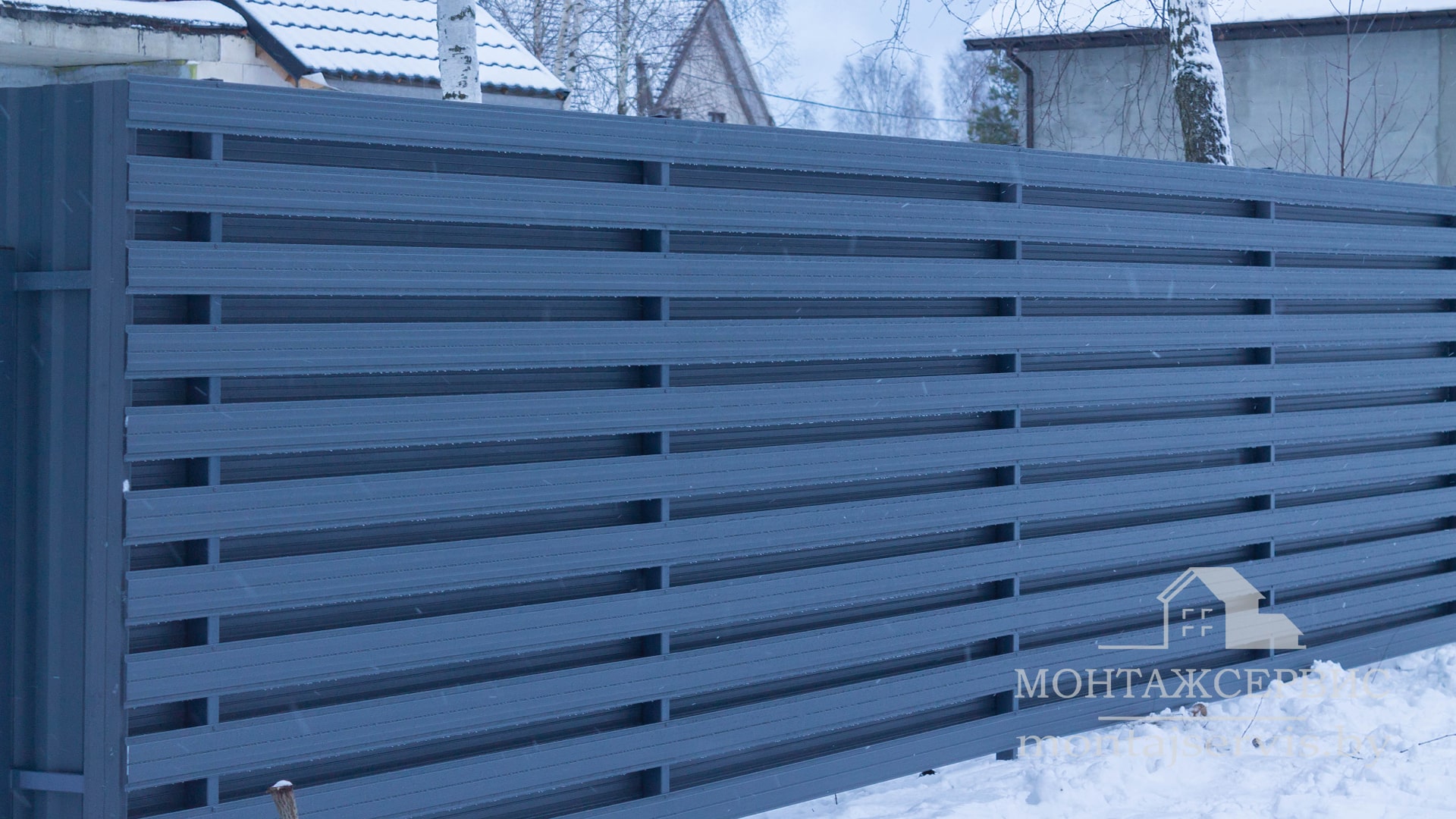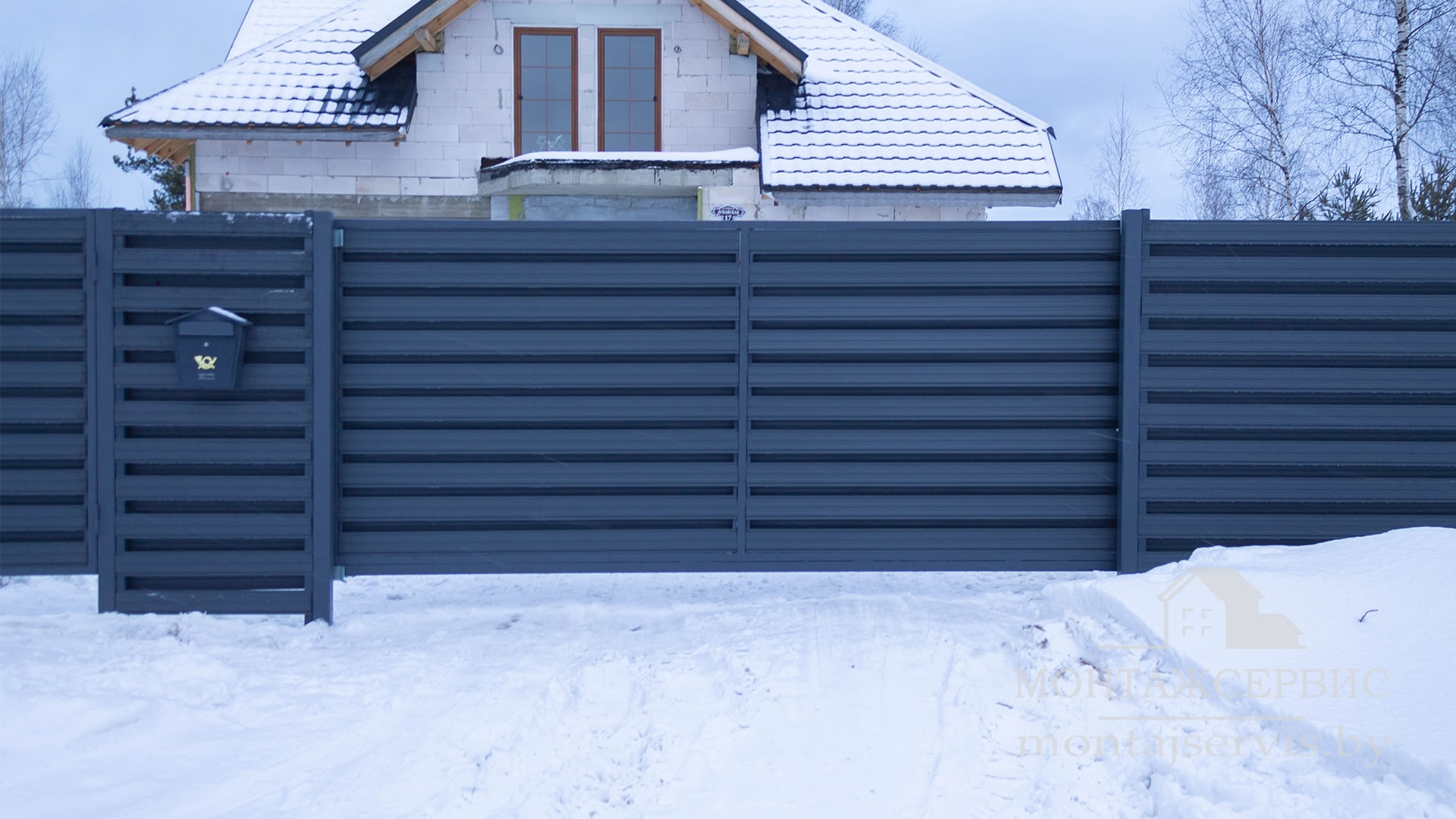 Монтаж забора РАНЧО из металлического штакетника "КЛАССИК 114 мм" RAl 7024 МАТ" + ворота откатные + калитка