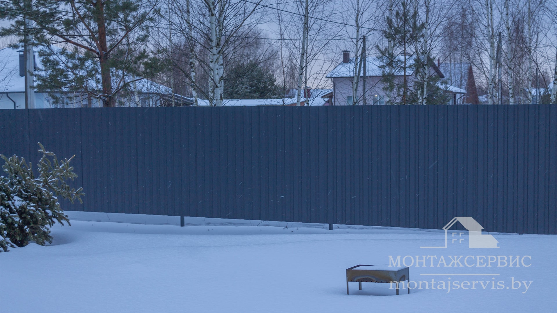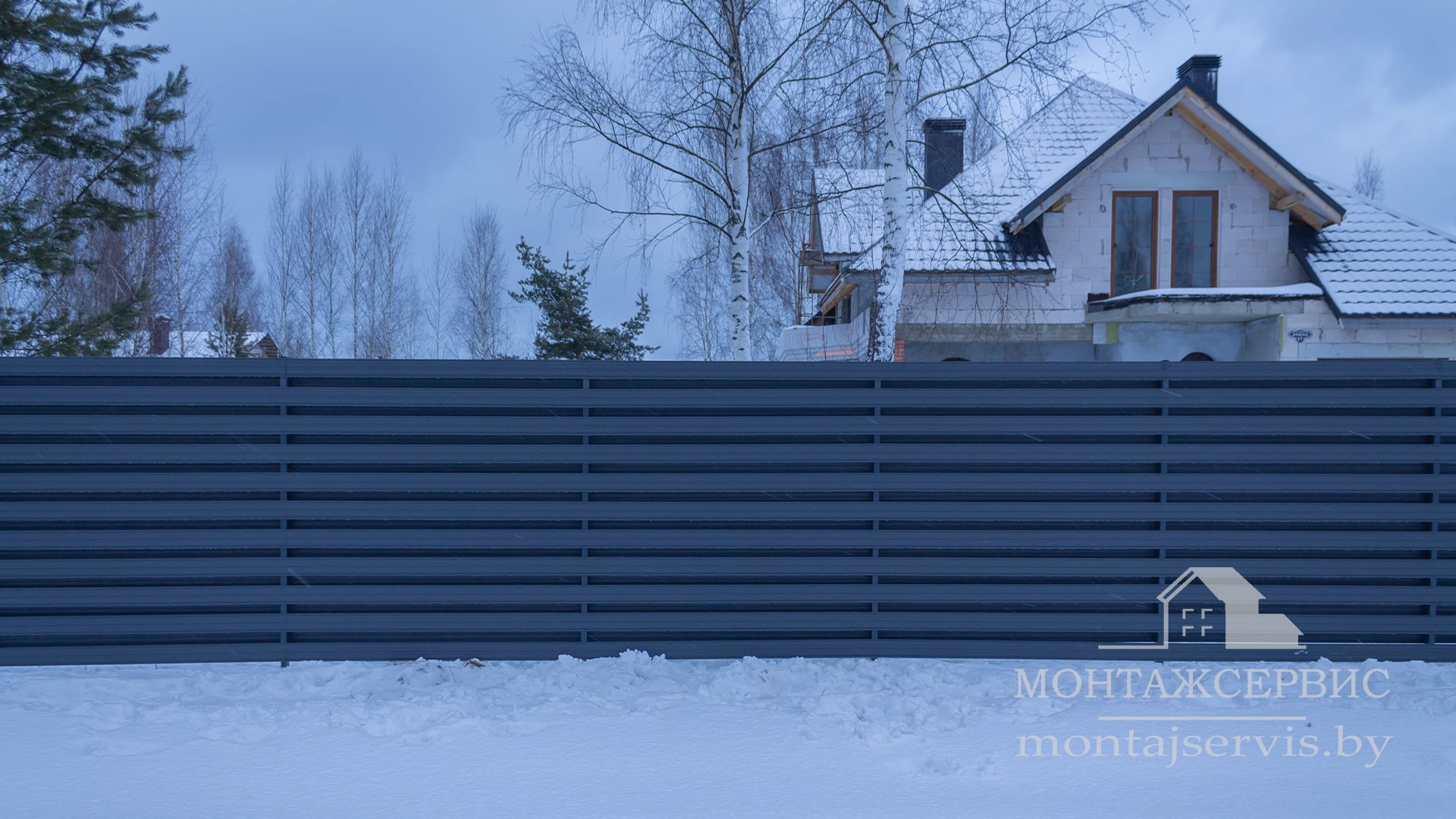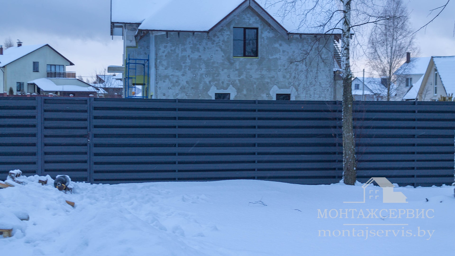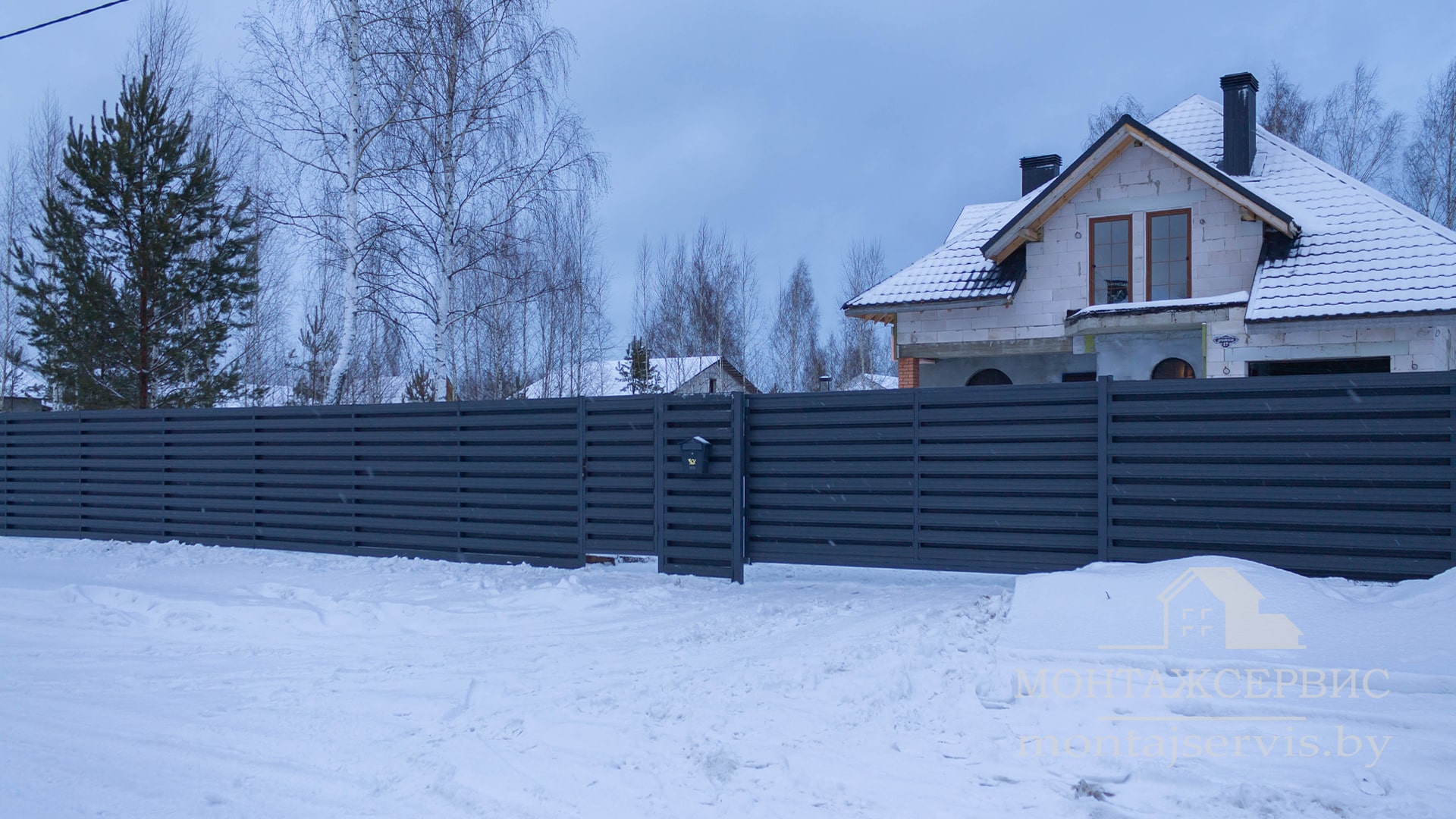 Монтаж забора РАНЧО из металлического штакетника "КЛАССИК 114 мм" RAl 7024 МАТ" + ворота откатные + калитка