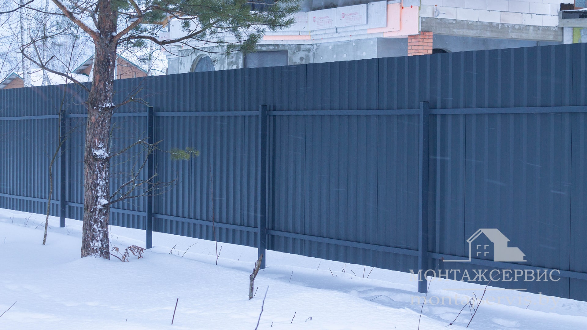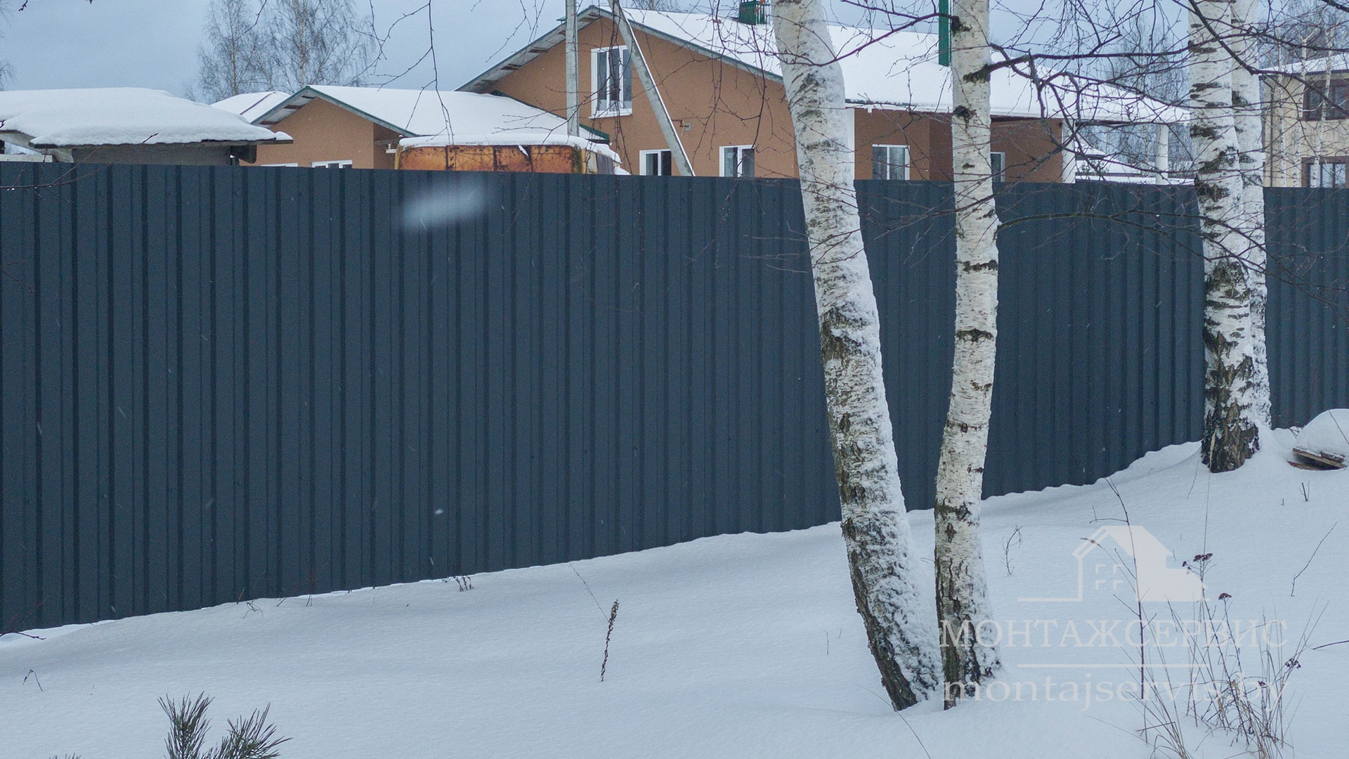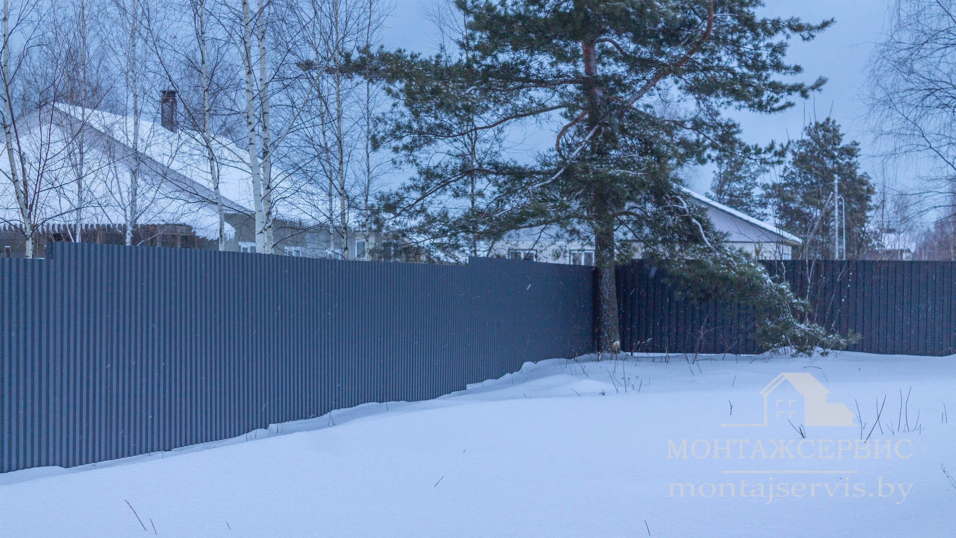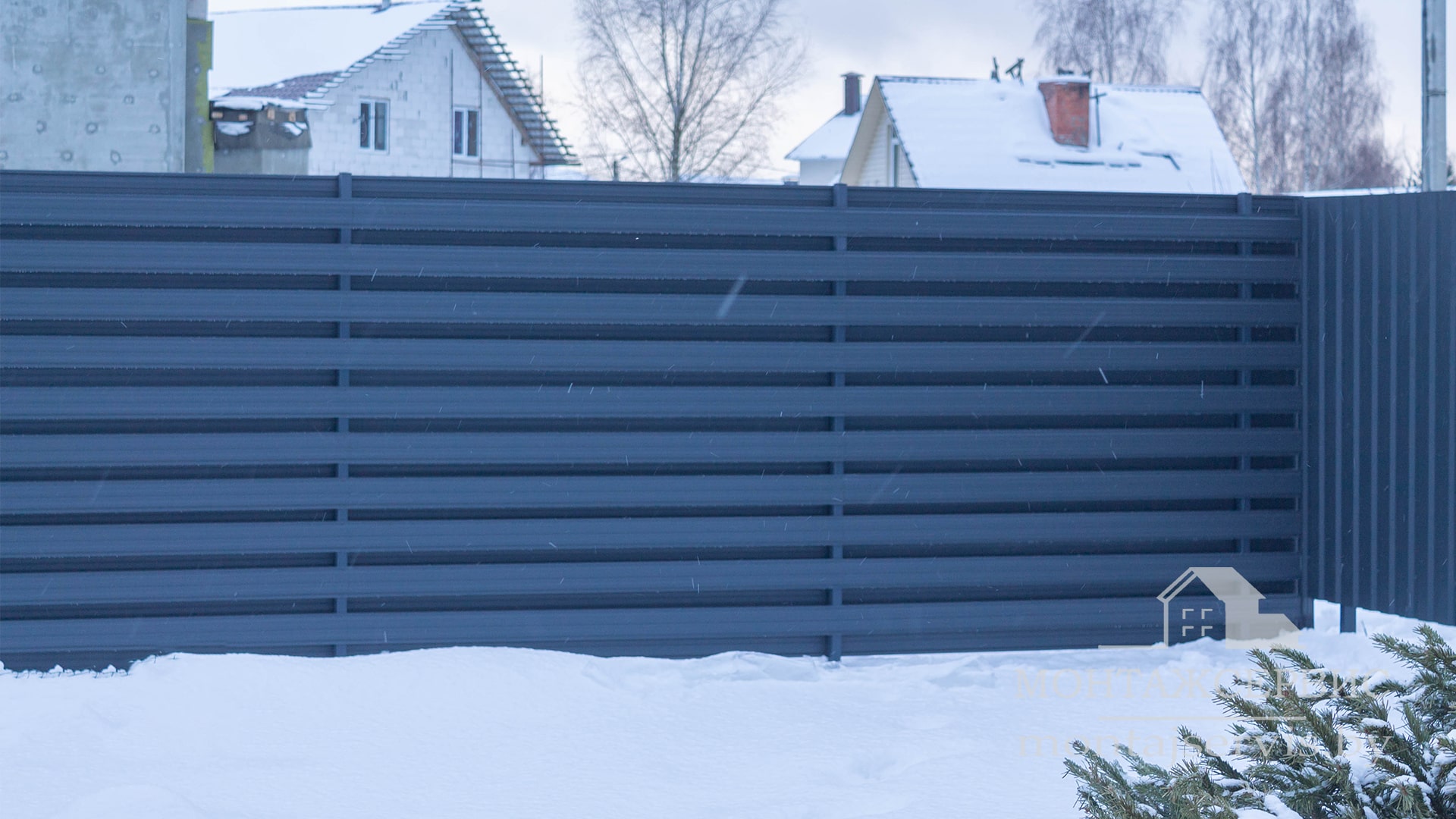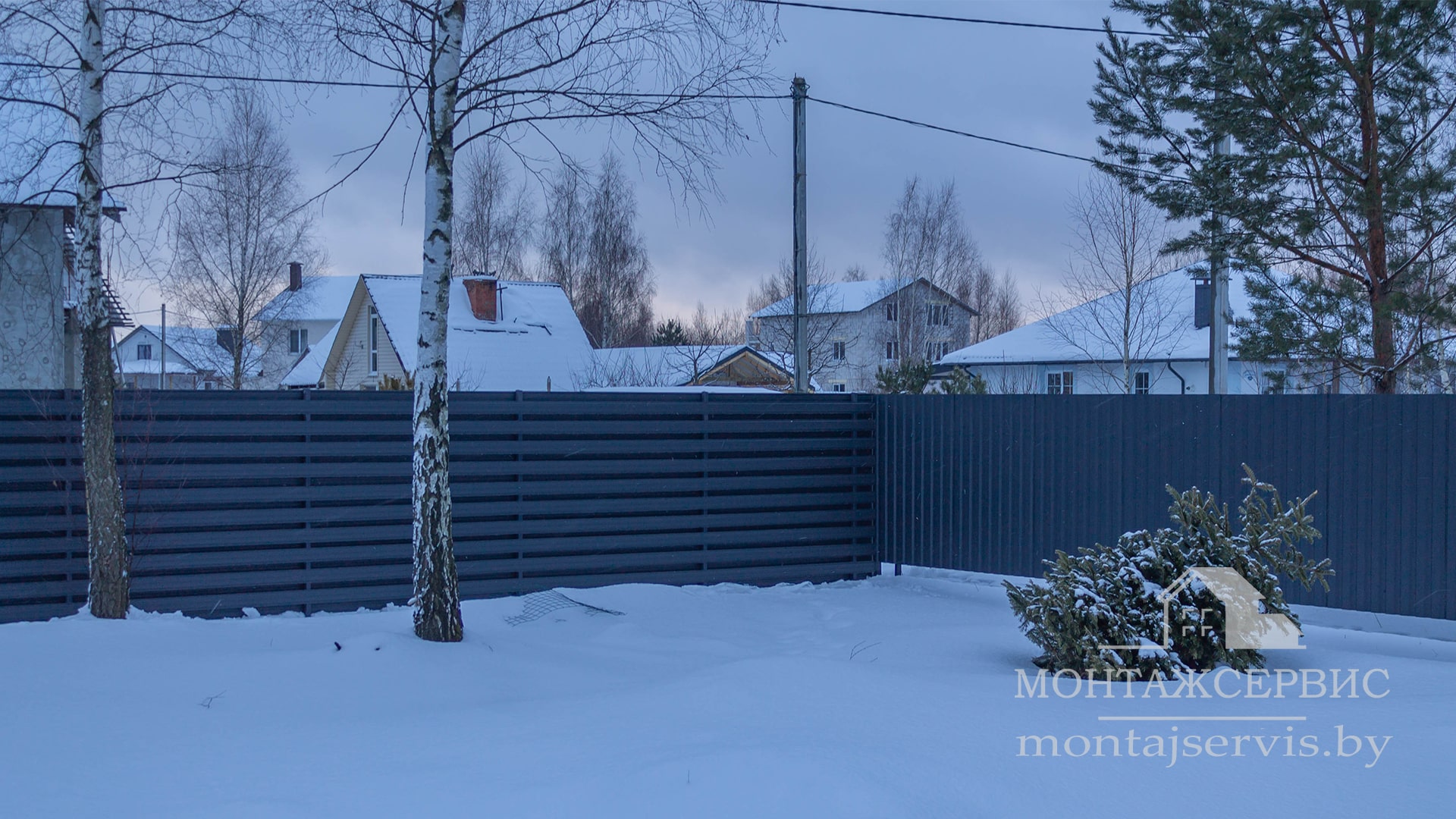 Монтаж забора РАНЧО из металлического штакетника "КЛАССИК 114 мм" RAl 7024 МАТ" + ворота откатные + калитка