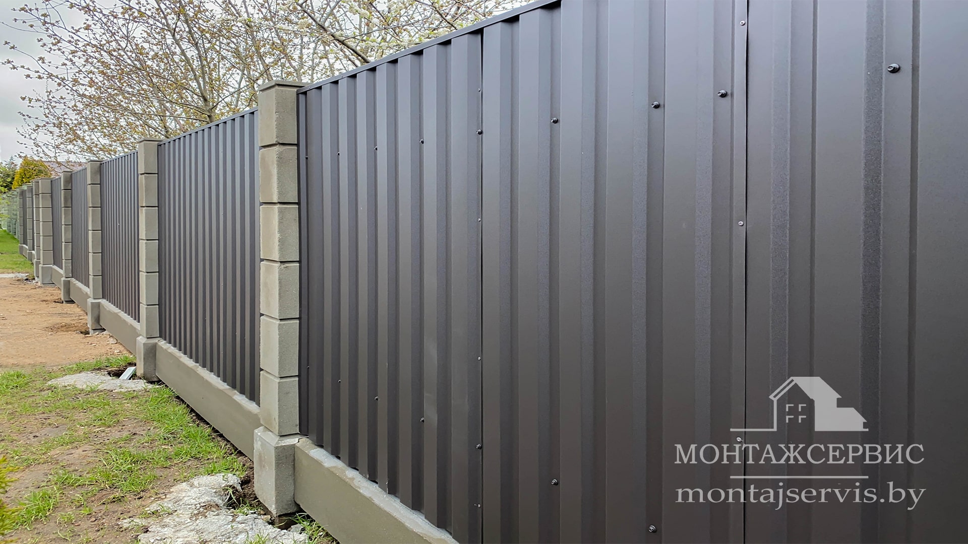 Монтаж модульного забора в сочетании с профнастилом МП-20 RAL 8019 МАТ + ворота откатные + калитка